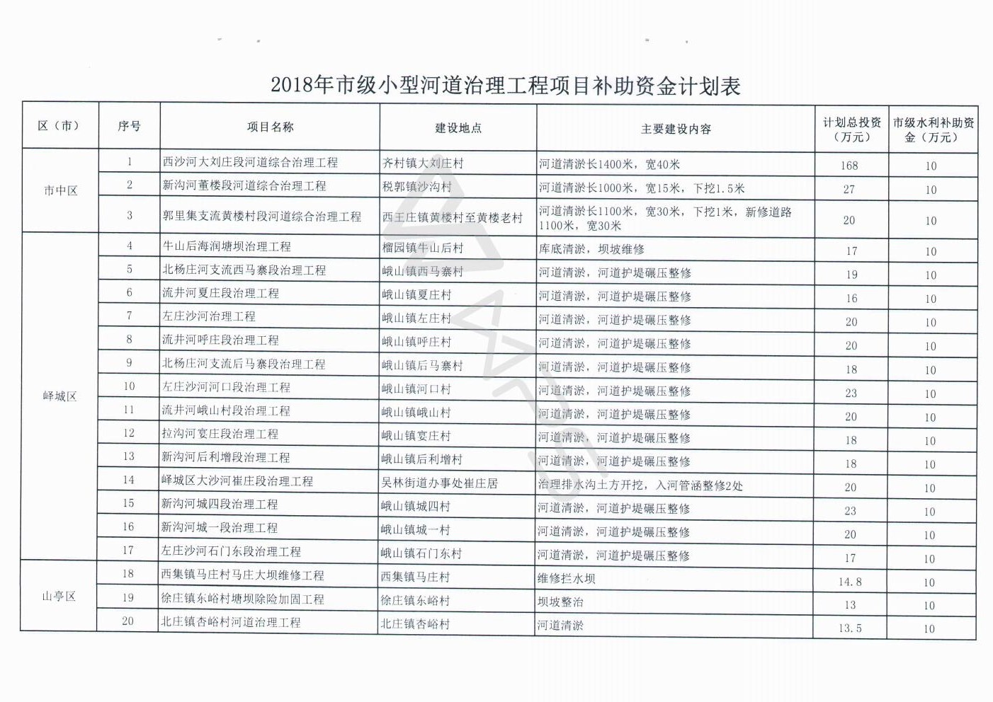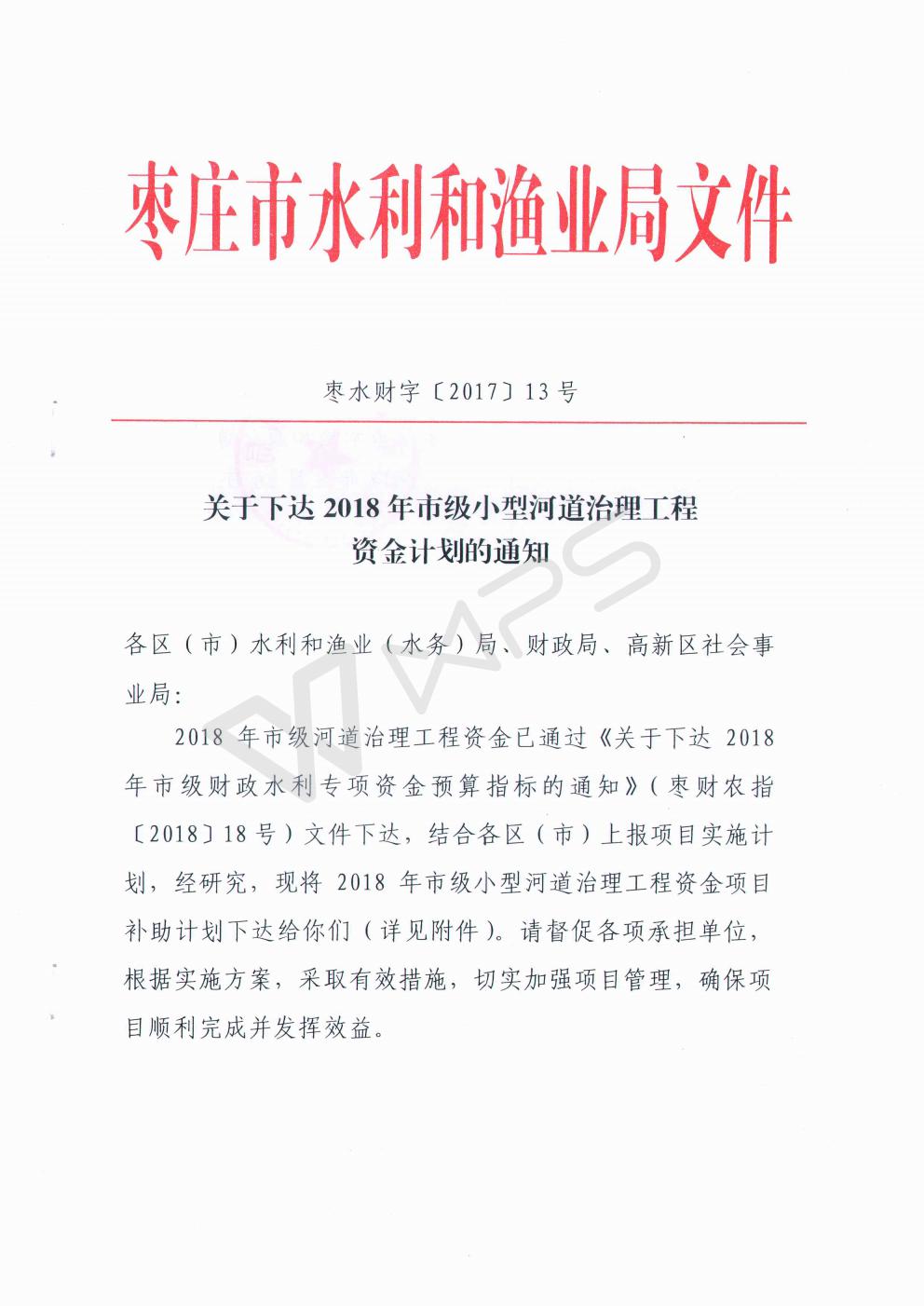关于下达2018年市级小型河道治理工程资金计划的通知